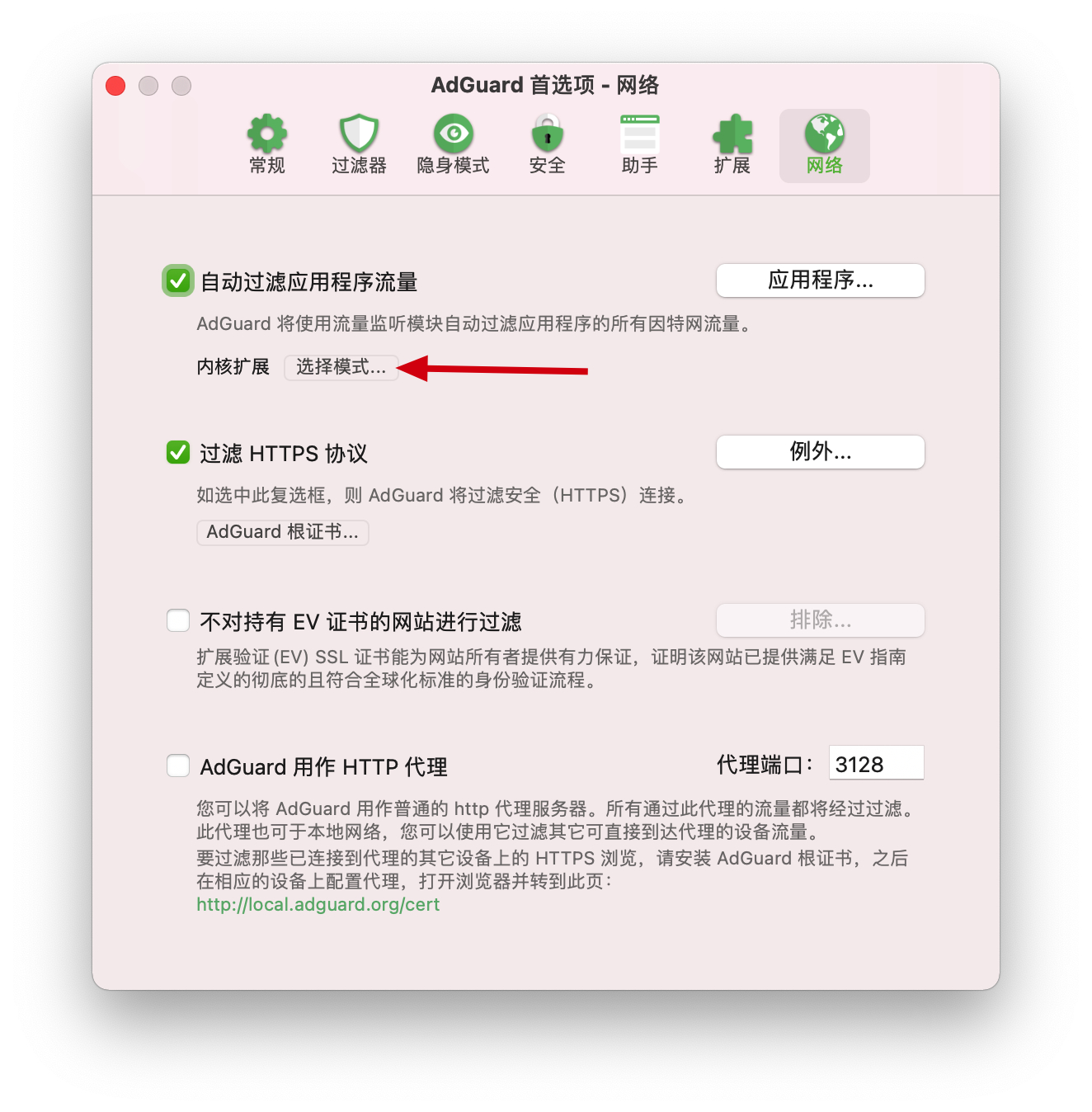 设置里进入首选项,选择网络标签,点击网络扩展后的选择模式,改为自动代理即可