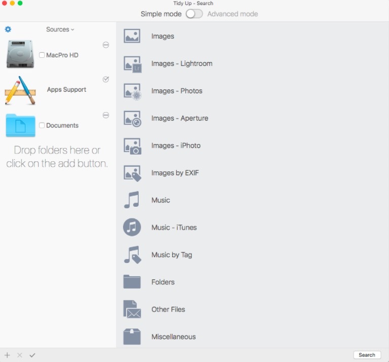Tidy Up带有简单模式的搜索模式,其中包括80多个预先定义的智能搜索。
