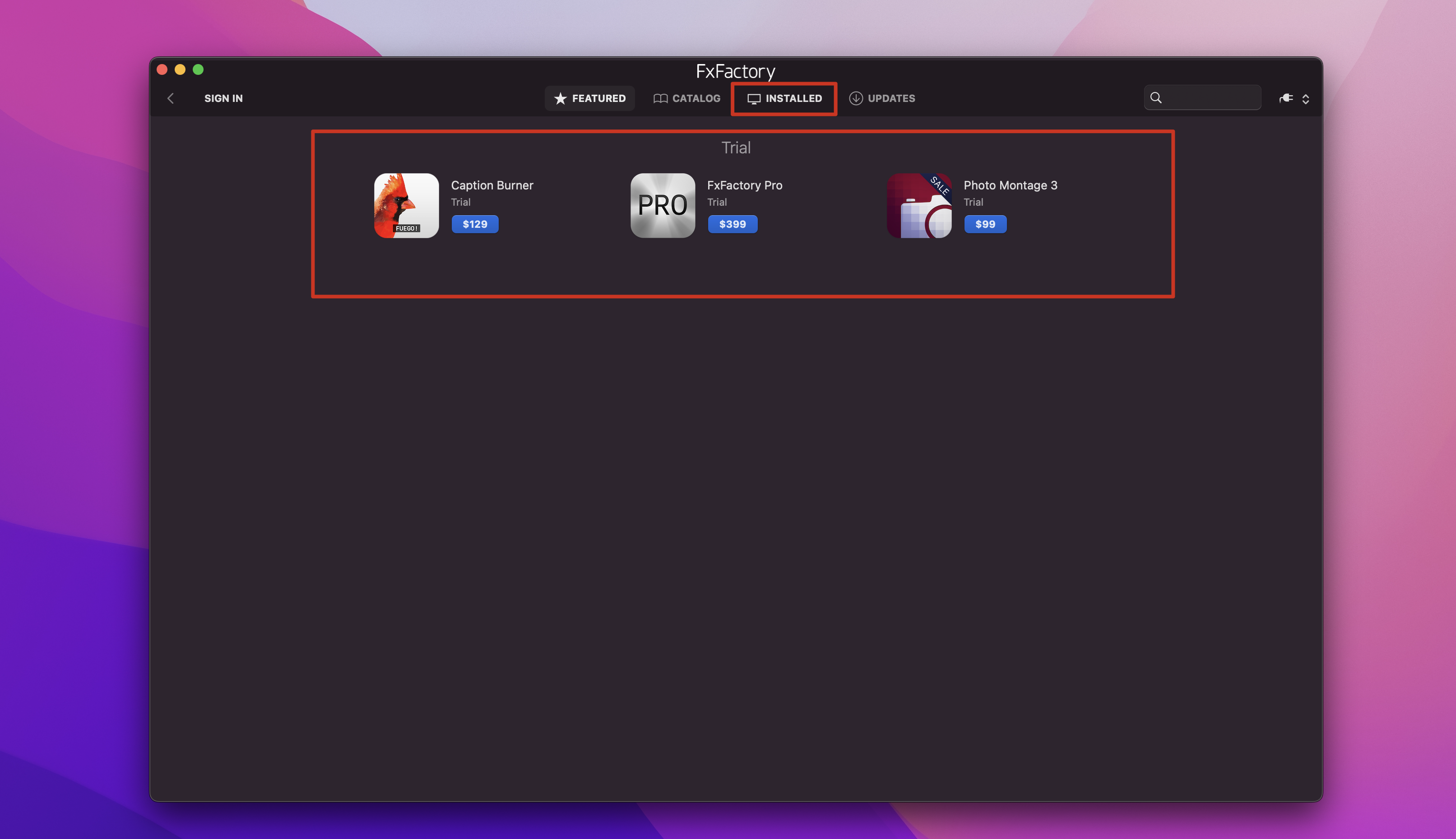 2.打开fxfactory mac,点击一个您需要安装的插件,如Caption Converter,我们点击Download Trial