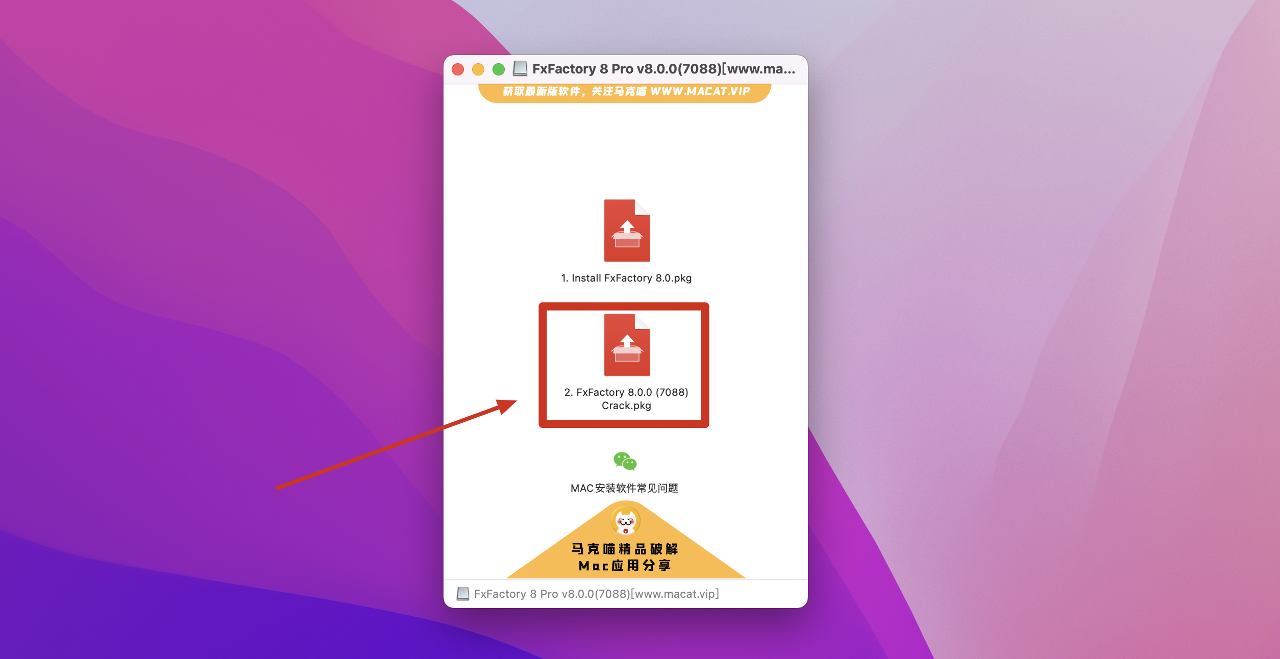 1.下载完成后打开“fxfactory 破解版”镜像包,双击打开【1. Install FxFactory 8.0.pkg】,如图: