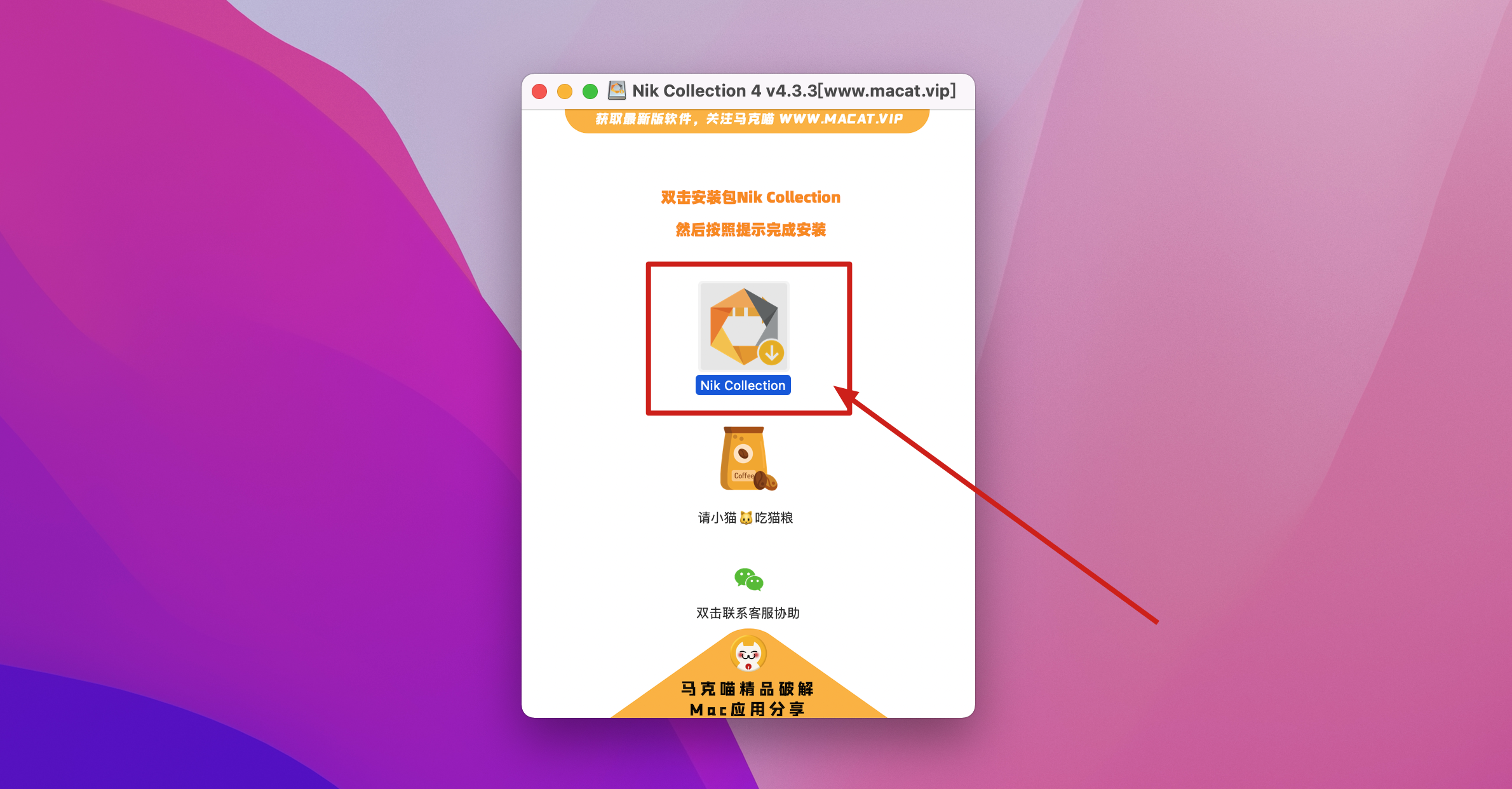 1.nik collection破解版镜像包下载完成后打开,双击安装包Nik Collection,然后按照提示完成安装。