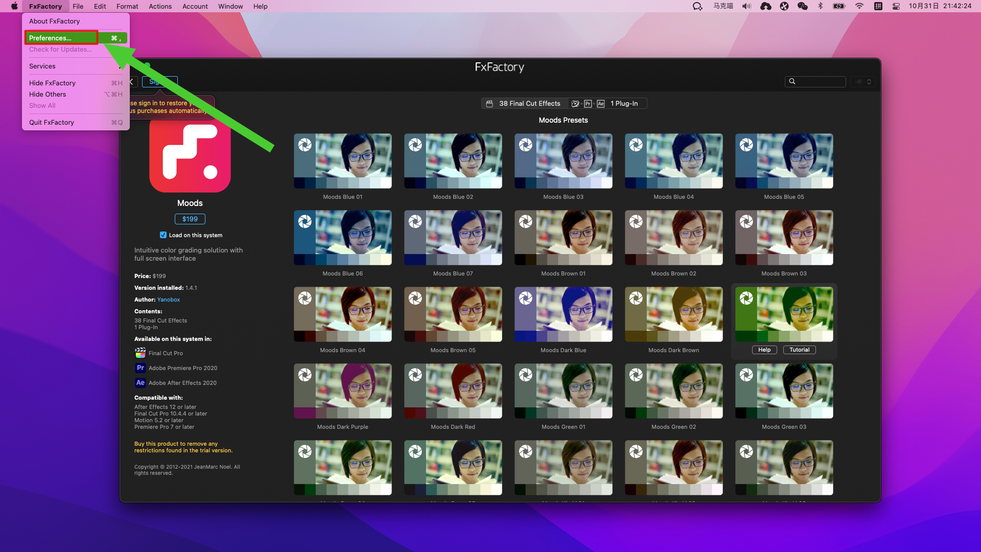 1.打开fxfactory mac,点击一个您需要安装的插件,如Moods,我们点击Download Trial