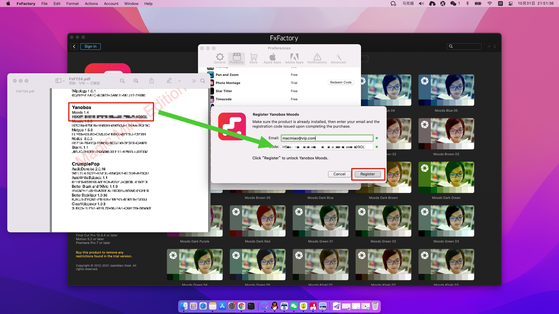 5.找到并复制对应名字的插件注册码粘贴到注册页面,输入自己的邮箱,点击Register即可激活,如图: