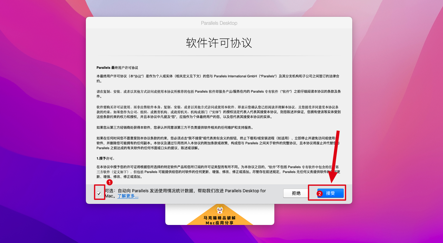 3.☑️去掉发送统计数据勾选,然后点【接受】