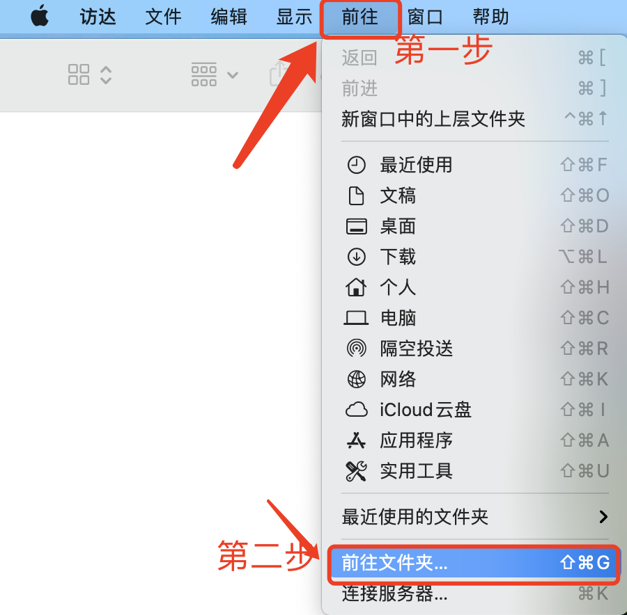 2.顶部菜单栏“前往”–“前往文件夹”,在目标路径里输入: