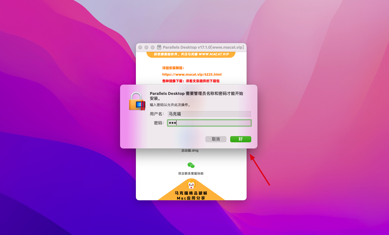 17.提示需要权限,输入【开机密码】,点击好 然后看桌面【顶部菜单栏】