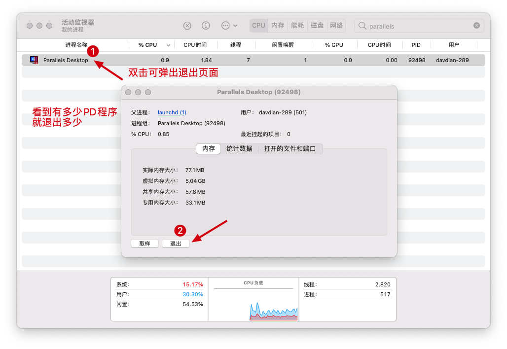 打开启动台 -> 其它 -> 活动监视器,右上角搜索 parallels,把搜索到的全部退出