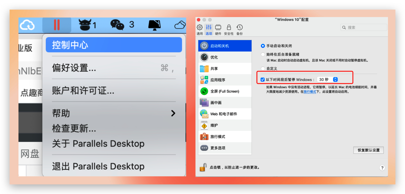 打开【控制中心】-【选项】-【启动与关机】-修改✅以下时间段暂停Windows30秒改为 30分钟