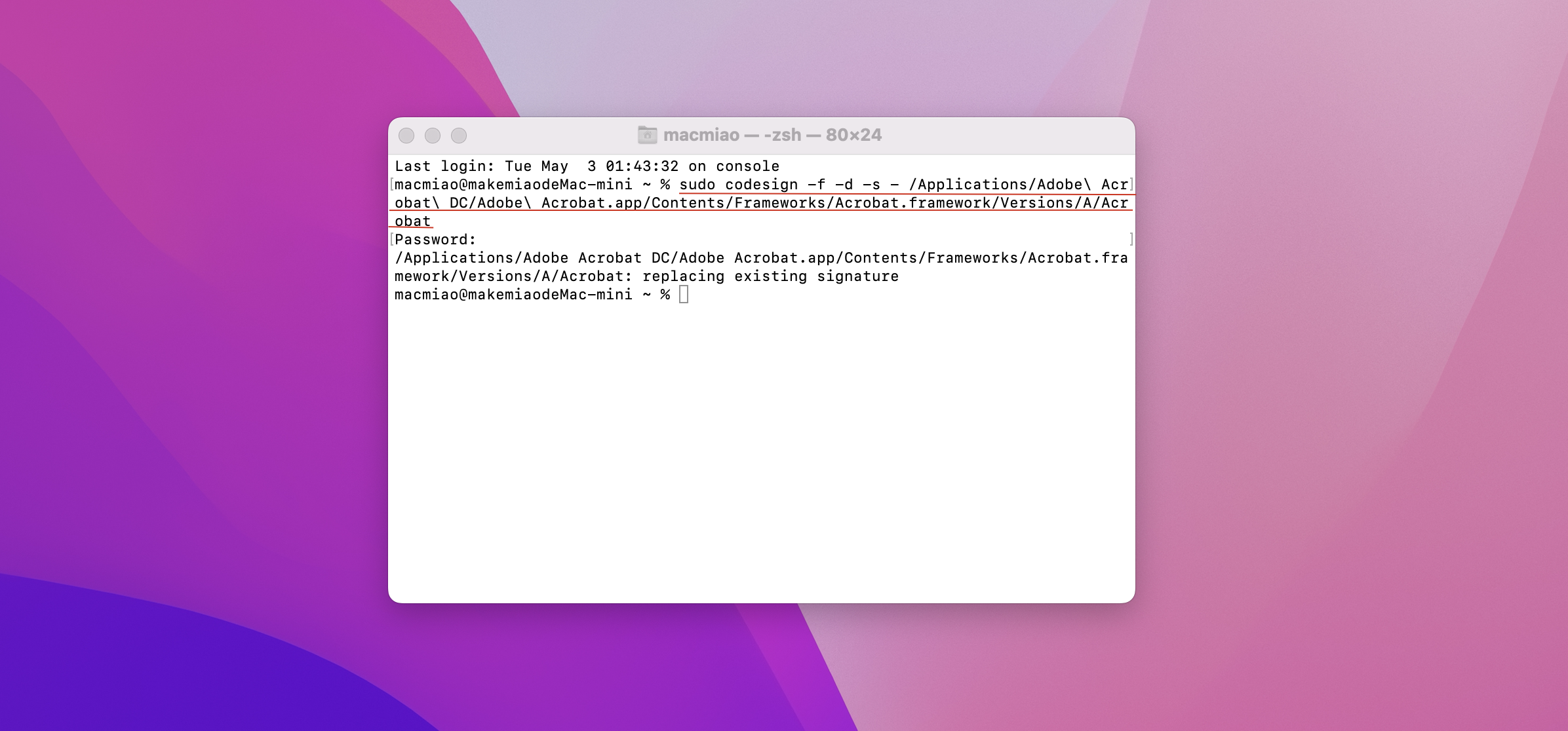 sudo codesign -f -d -s - /Applications/Adobe\ Acrobat\ DC/Adobe\ Acrobat.app/Contents/Frameworks/Acrobat.framework/Versions/A/Acrobat