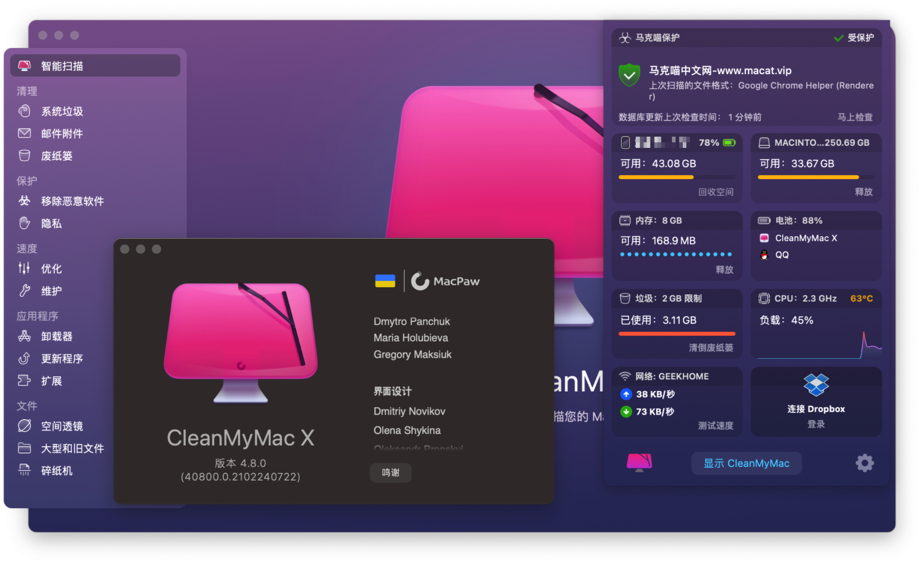 CleanMyMac X 4.8.0是搜集到的一个系统清理工具,删除系统缓存文件 , 多余的应用程序语言包 , PowerPc软件运行库等。 是个给你的硬盘瘦身的好工具。新版本采用全新的UI设计,支持macOS 10.15。