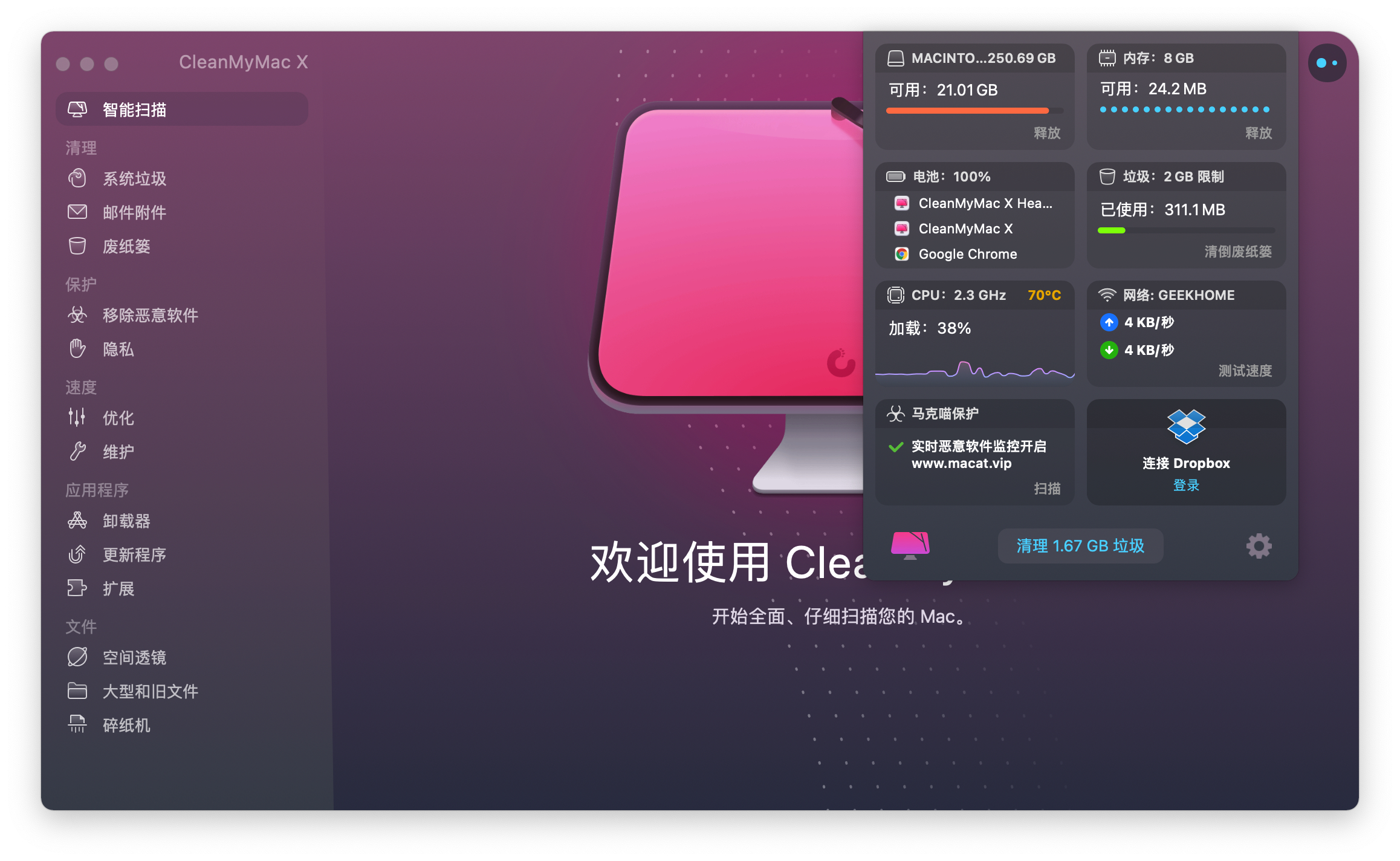 CleanMyMac X 4.7.2是搜集到的一个系统清理工具,删除系统缓存文件 , 多余的应用程序语言包 , PowerPc软件运行库等。 是个给你的硬盘瘦身的好工具。新版本采用全新的UI设计,支持macOS 10.15。