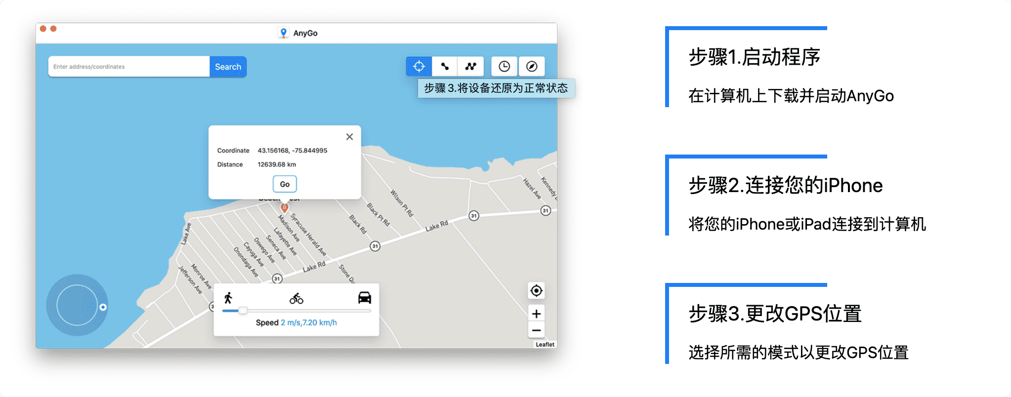 AnyGo for mac 是一款优秀的修改手机定位的软件,它能帮助你迅速的修改你的iphone的实时定位